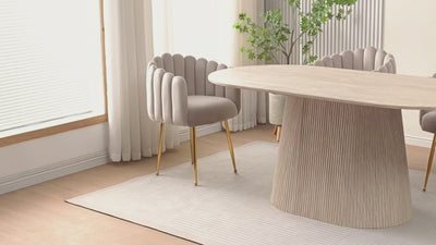 Kombinieren Sie den TIANA-Tisch mit Stühlen aus Samt- oder Bouclé-Stoff, um die Eleganz Ihres Raums zu vervollständigen und einen einladenden und eleganten Essbereich zu schaffen.