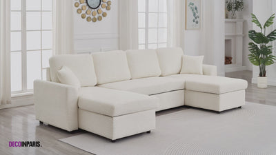 ADRYEN Panorama-Schlafsofa mit Staufächern in beigefarbenem Bouclé-Stoff
