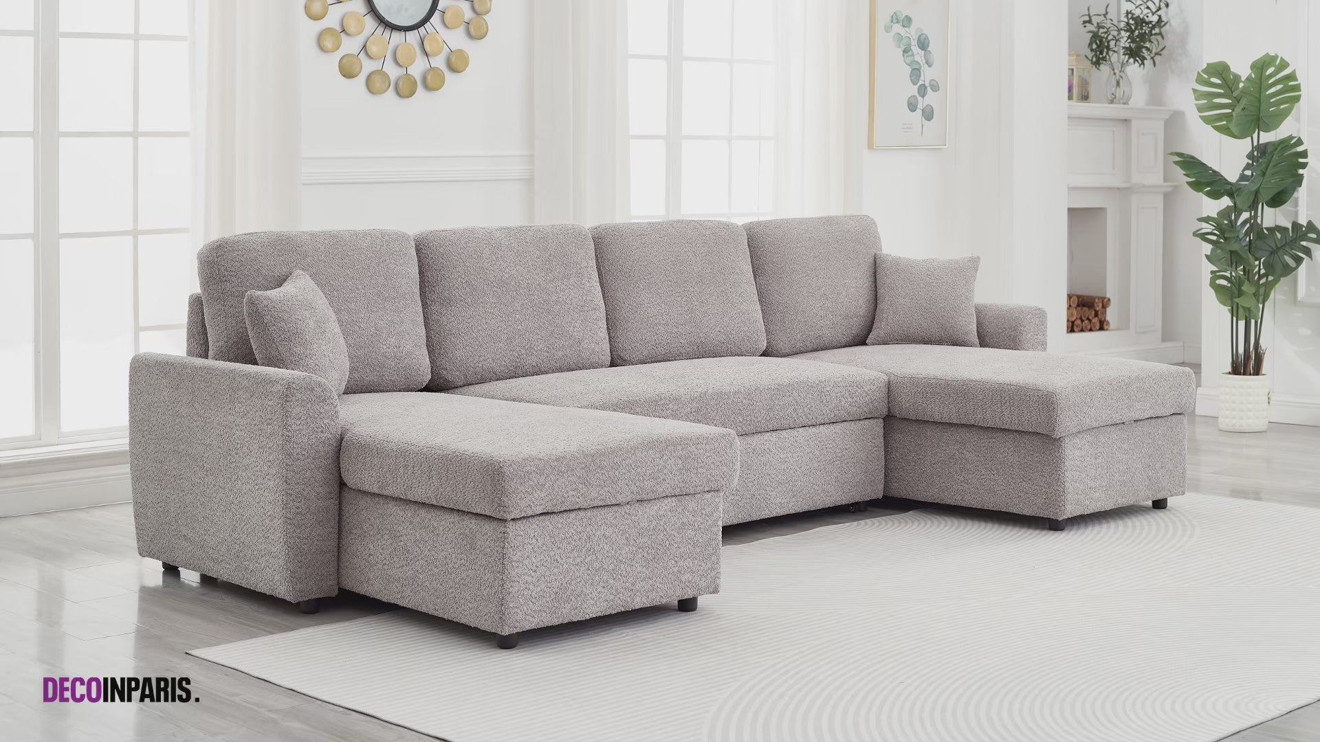 ADRYEN Panorama-Schlafsofa mit Staufächern in grauem Bouclé-Stoff