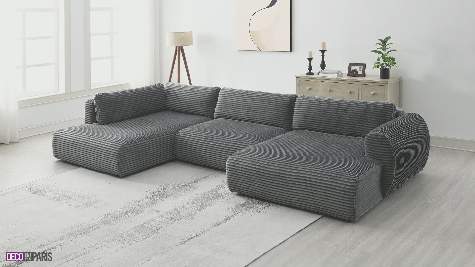 Das umwandelbare Panoramasofa TILDA aus grauem Grobsamtcord ist die perfekte Lösung für die Gestaltung eines gemütlichen und eleganten Interieurs, das Komfort, Stil und Funktionalität vereint.