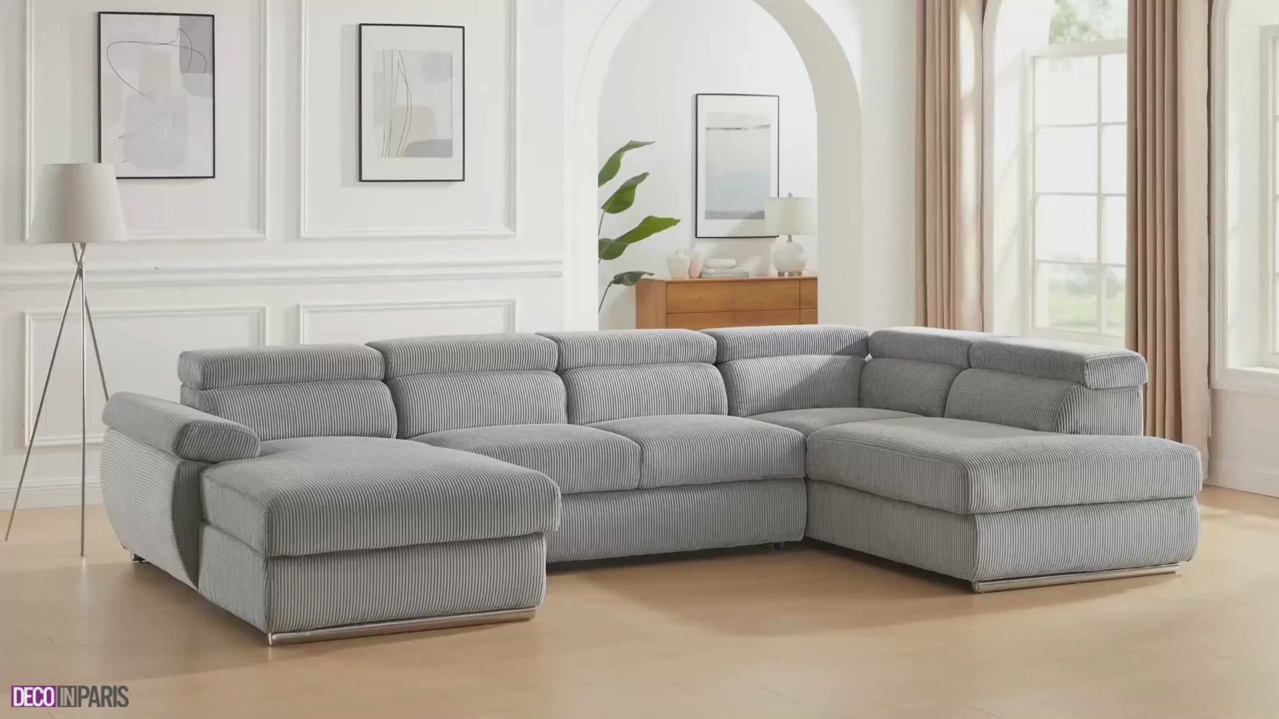 Mit seiner eleganten Optik passt das umbaubare Ecksofa MARIANO in jedes Interieur. Sein entschieden moderner Look kombiniert mit der trendigen, dicken Cordpolsterung sorgt für einen Wohnraum voller Weichheit. Seine großzügigen, abgerundeten Kurven und die Finesse des silberverchromten Metallgestells verleihen Ihrem Wohnzimmer einen Hauch von Charme und Authentizität.