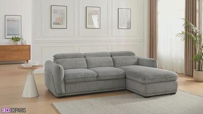 Verlieben Sie sich in das Ecksofa PETUNIA mit Schlaffunktion für die rechte Seite aus dickem grauem Cord , eine perfekte Kombination aus Eleganz und Funktionalität, die Ihrem Wohnzimmer Charme und Komfort verleiht.