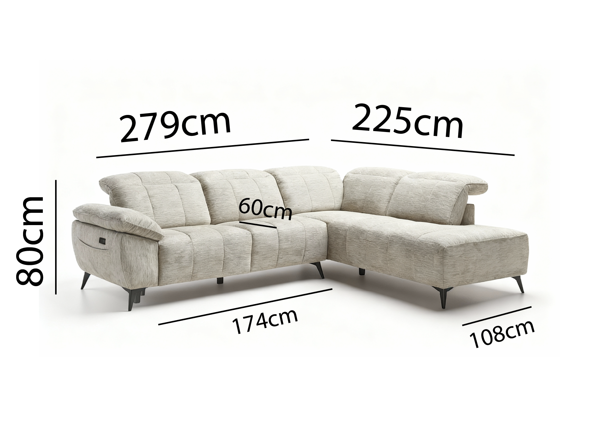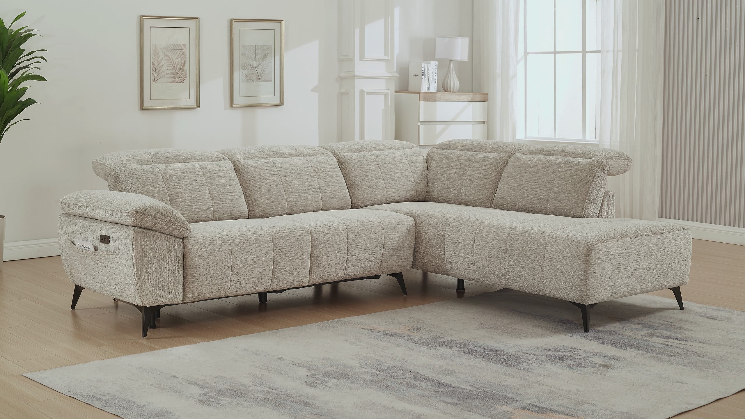 SOLINA Ecksofa mit elektrischer Verstellung aus beige meliertem Samt – rechtwinklig
