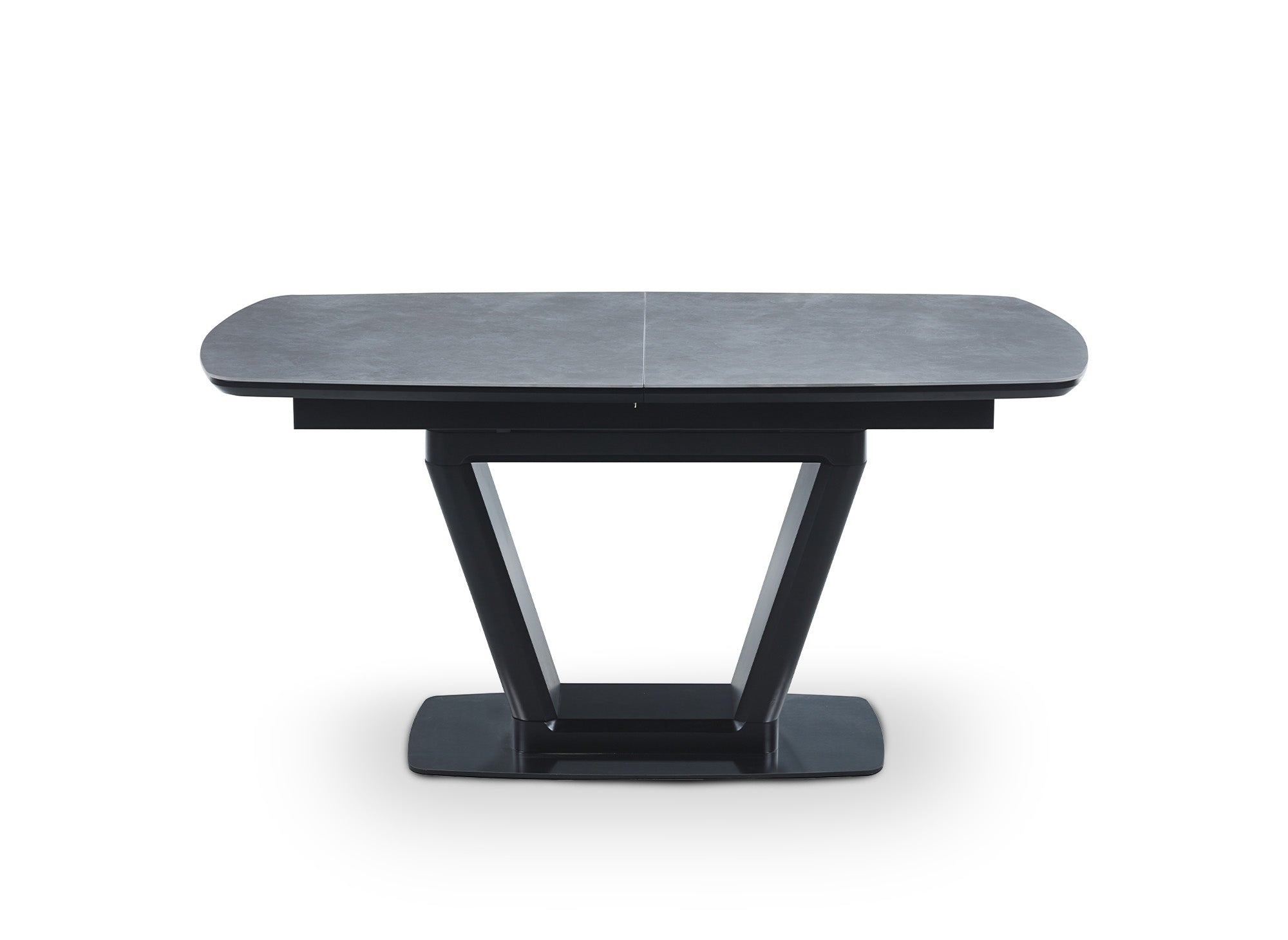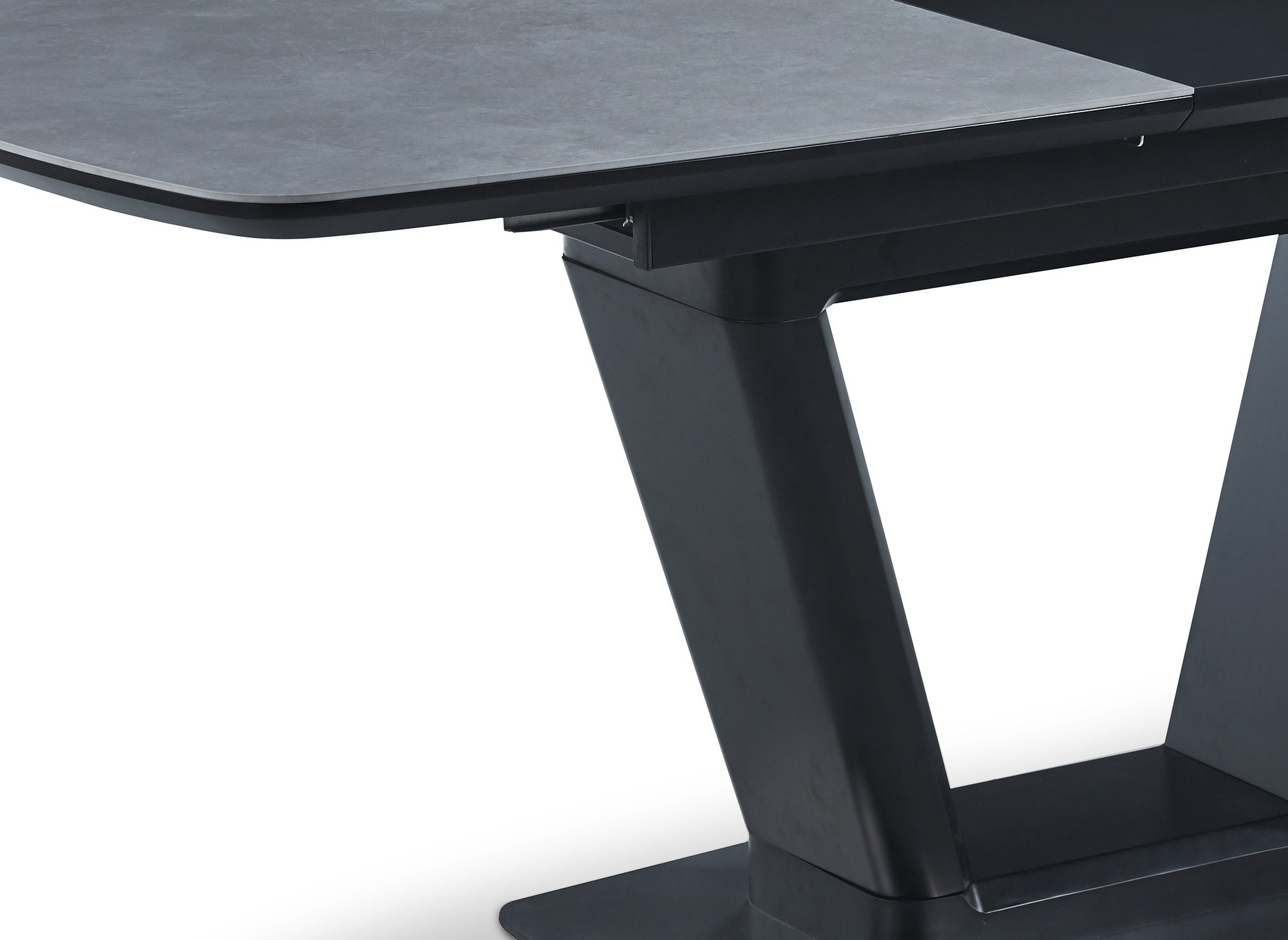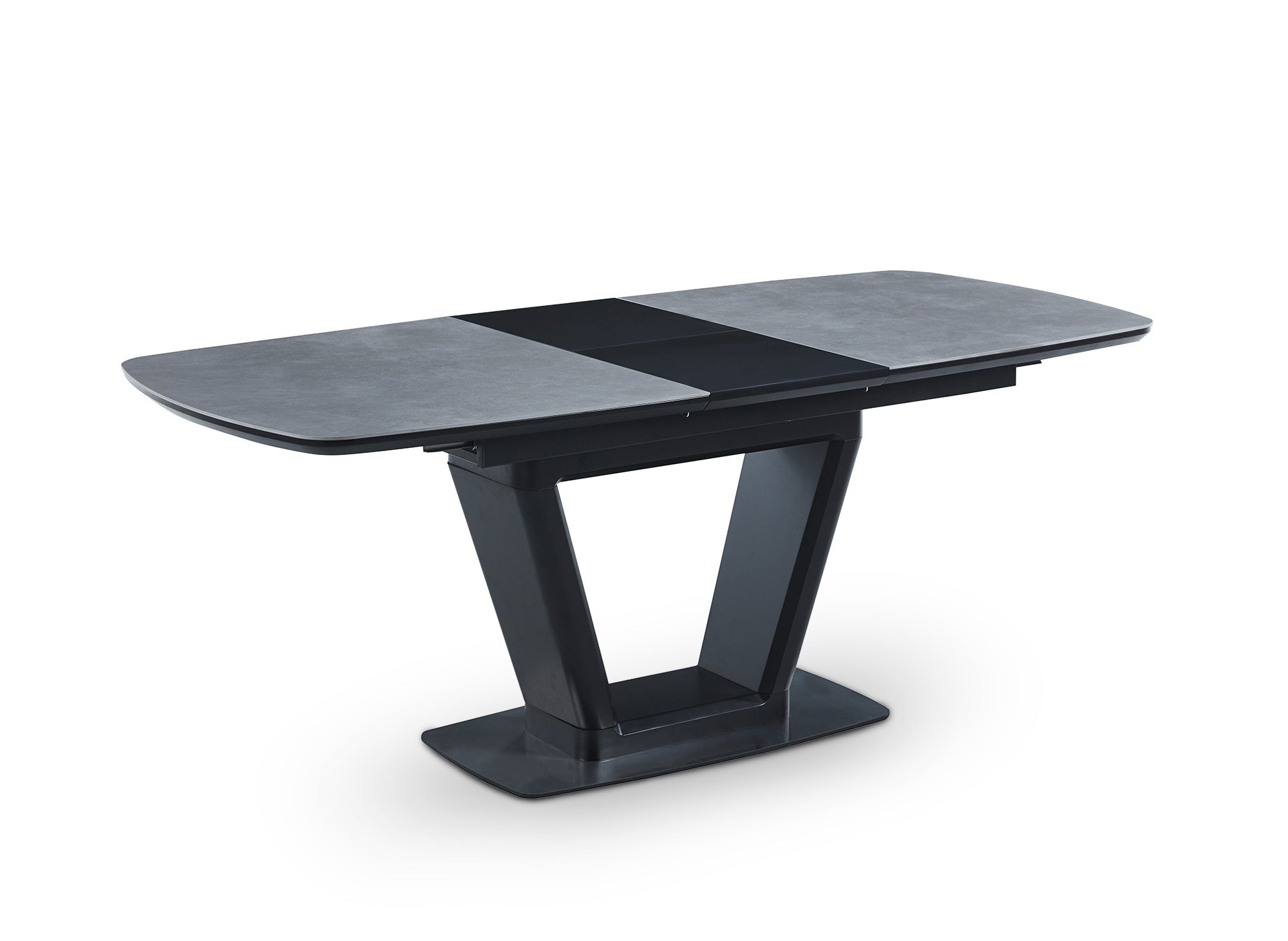 Entdecken Sie den ausziehbaren rechteckigen Esstisch PIERROT mit grauer Keramikplatte und schwarzer Glasverlängerung!