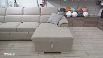 Entdecken Sie unser prächtiges umwandelbares Panoramasofa mit Aufbewahrungsbox im beigen Stoff OLIVER – Linke Winkel!