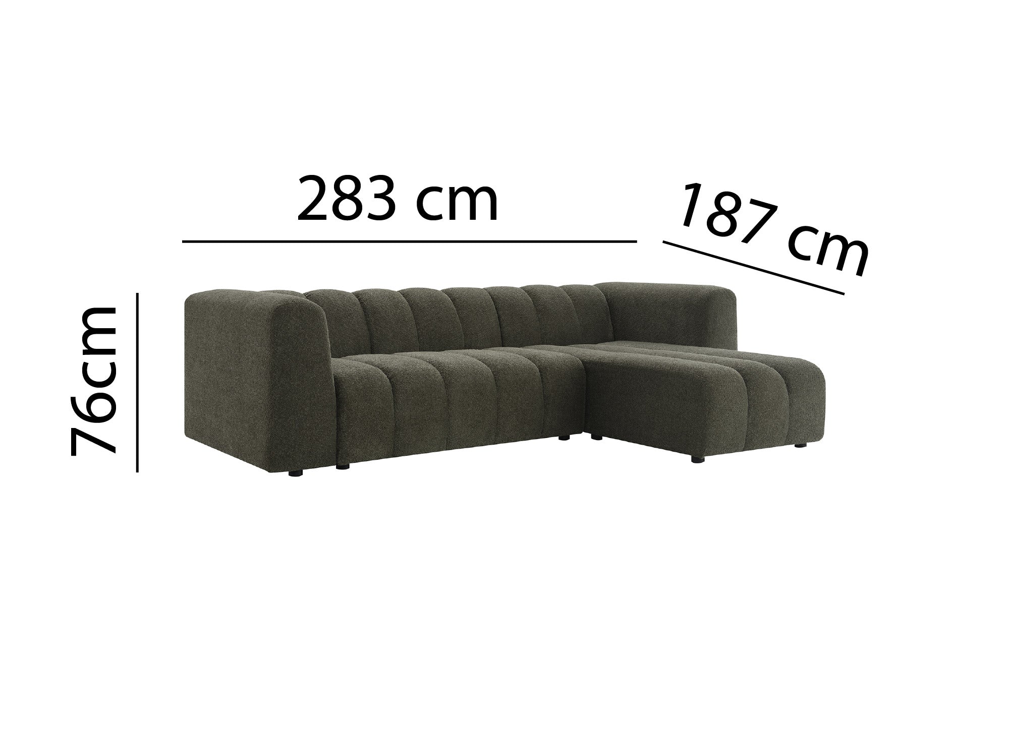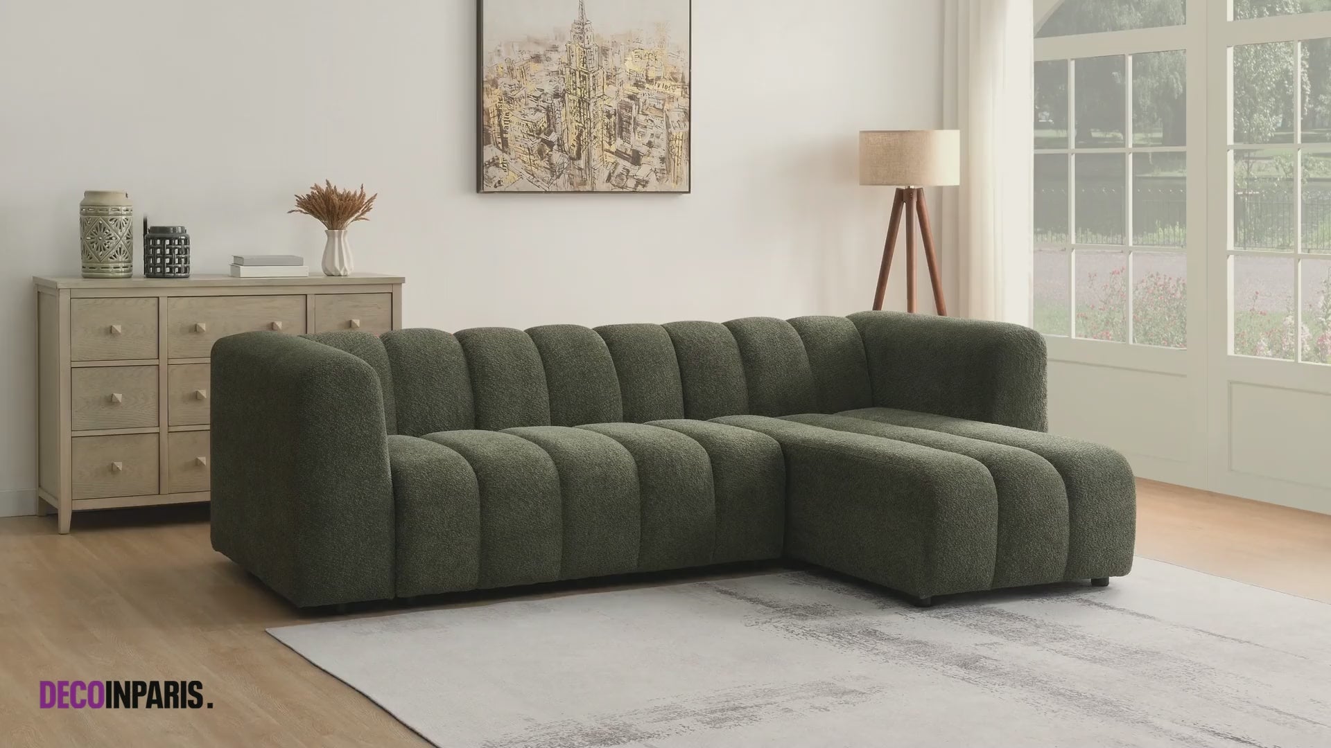 Zusammenfassend lässt sich sagen, dass das wendbare Ecksofa AELIS aus grünem Bouclette-Stoff die ideale Wahl für alle ist, die nach Möbeln suchen, die sowohl trendig als auch bequem sind.
