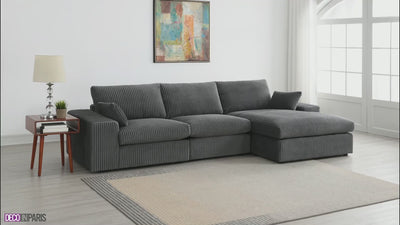 Entdecken Sie das wendbare Ecksofa SIRINA mit weicher, dicker grauer Rippung , ideal, um Ihrem Wohnzimmer einen Hauch von Modernität und Eleganz zu verleihen. Seine raffinierte Ästhetik und die Cordpolsterung fügen sich harmonisch in alle Einrichtungsstile ein, ob Designer, klassisch oder modern.
