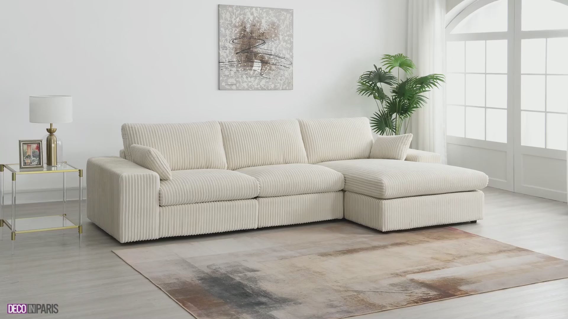 Entdecken Sie das wendbare Ecksofa SIRINA aus weichem, beigefarbenem Rippenstoff , ideal, um Ihrem Wohnzimmer einen Hauch von Modernität und Eleganz zu verleihen. Seine raffinierte Ästhetik und die Cordpolsterung fügen sich harmonisch in alle Einrichtungsstile ein, ob Designer, klassisch oder modern.