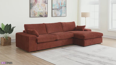 Entdecken Sie das wendbare Ecksofa SIRINA aus weichem Terrakotta-Rippstoff , ideal, um Ihrem Wohnzimmer einen Hauch von Modernität und Eleganz zu verleihen. Seine raffinierte Ästhetik und die Cordpolsterung fügen sich harmonisch in alle Einrichtungsstile ein, ob Designer, klassisch oder modern.
