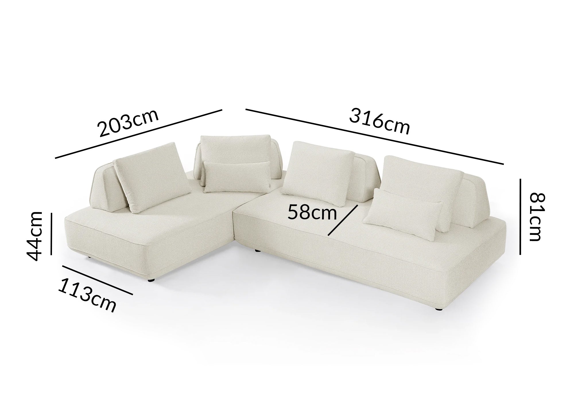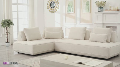 Verleihen Sie Ihrem Wohnzimmer mit dem wendbaren Ecksofa ISAORA aus beigem Bouclette-Stoff einen Hauch von Weichheit und Eleganz.