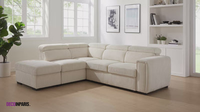 Lassen Sie sich vom Ecksofa ZENOVA aus dickem, beigem Cord verführen, das Komfort, Design und Funktionalität vereint. Dank seiner weichen und strukturierten Polsterung aus dickem Cord verleiht es Ihrem Interieur eine warme und raffinierte Note.